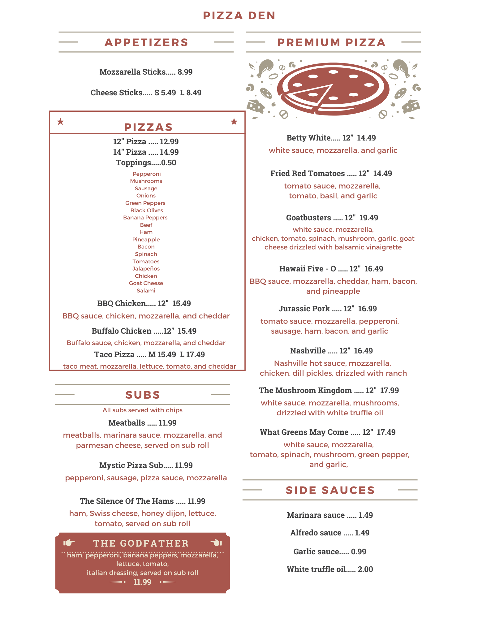 At Pizza Den, our restaurant menu offers something for everyone, including online ordering via the slice app. We are famous for our handcrafted pizzas, made with fresh dough and a variety of toppings. You can also enjoy classic entrees, such as our savory spaghetti. For those who love variety, our popular lunch and dinner buffet is the perfect choice.
